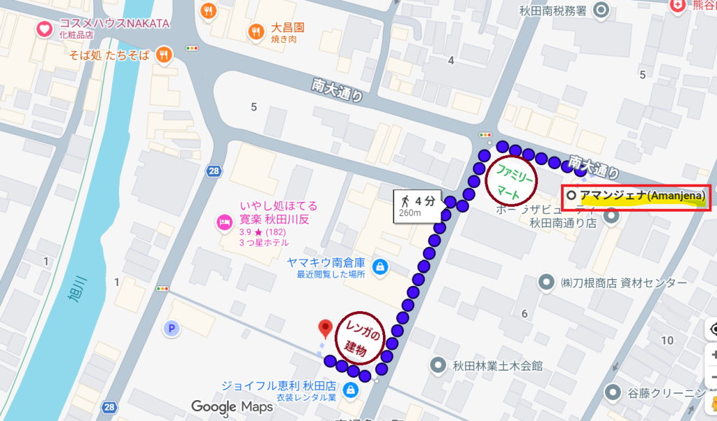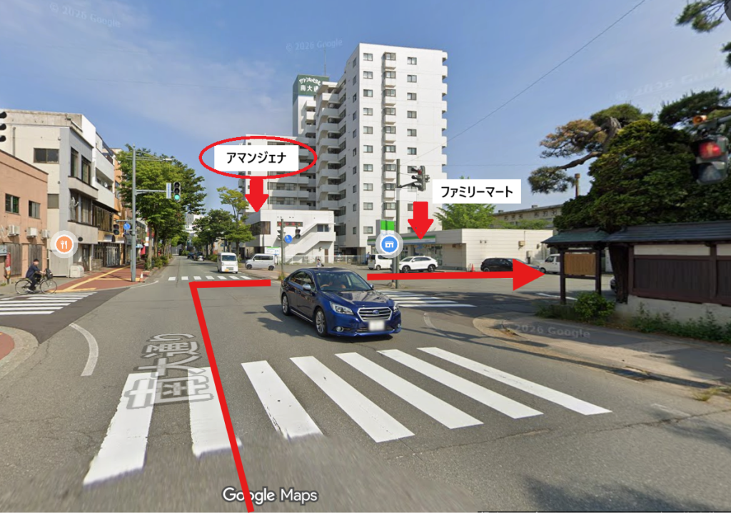 ファミリーマートの交差点を右折。右手にレンガの茶色の建物を目指してください。