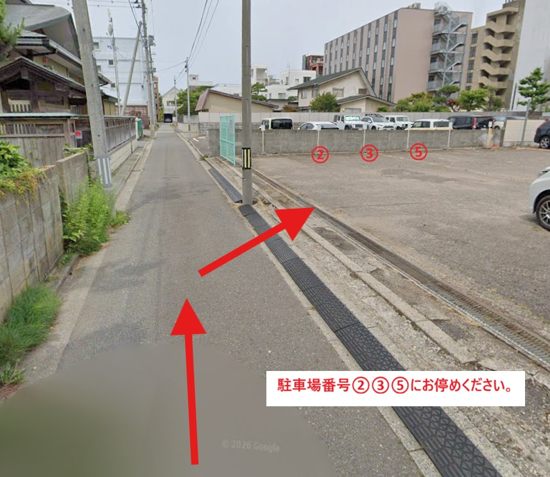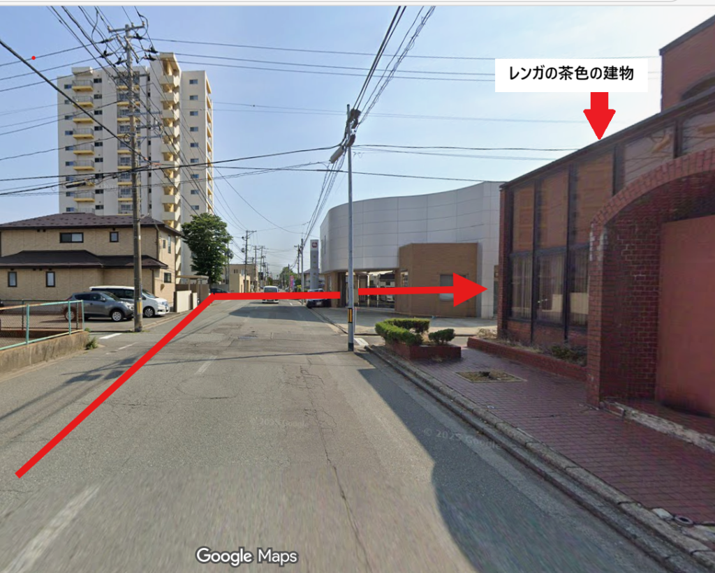 レンガの茶色の建物が見えてきたら、その角を右折。茶色の建物の裏手が駐車場になります。