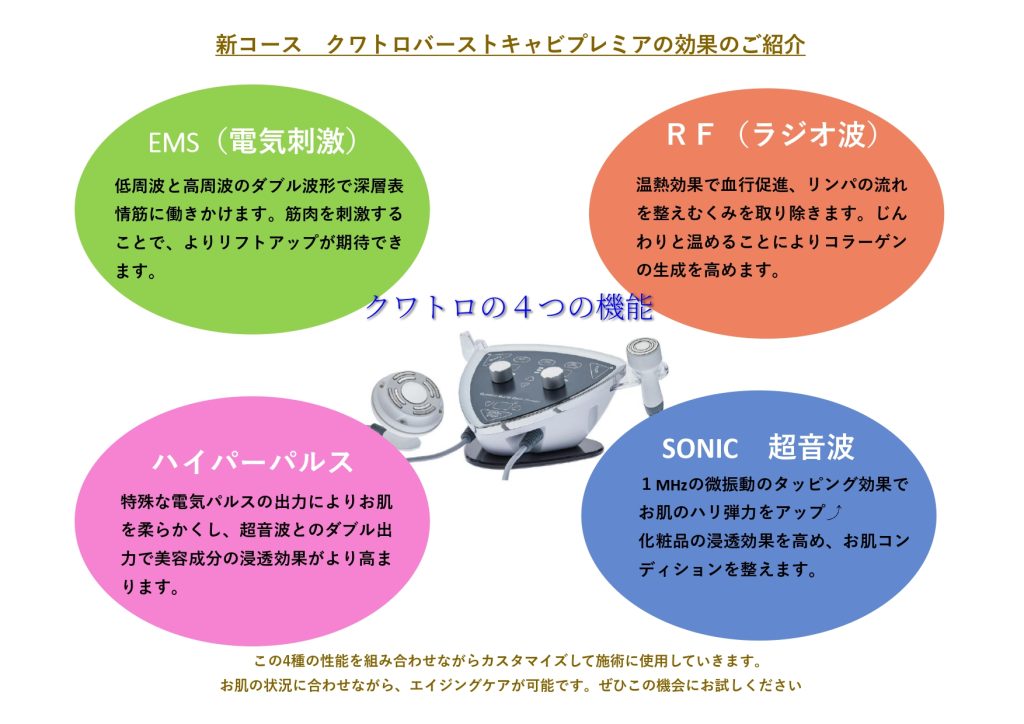 4つの機能を備えた新機器でエイジングの3大悩み「シミ、しわ、たるみ」を改善し、よりリラックス効果を高めた充実の新コースをご用意しました。